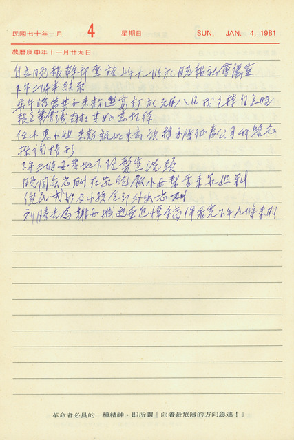 本件為吳三連1981年1月4日之日記。吳三連本日上午與《自立晚報》幹部進行座談;下午與吳牛港、任小惠等人會晤。晚間,長女吳梨雪來訪,四子吳俊民一家外出應酬,而劉勝吉來訪索取謝國城逝世追悼稿件。   《自立晚報》由顧培根創辦於1947年,為臺灣第一份晚報,曾歷經數次改組,亦因政治因素遭停刊三次,並於解嚴後,因不堪媒體市場競爭激烈而於2001年正式停刊。早年因經營困難,數次易主,於1959年第三次改組後,吳三連任常務董事長兼發行人,並秉持以「無黨無派、獨立經營」之理念,對中壢事件、美麗島事件等皆有詳實報導,曾獲得大眾不少支持。