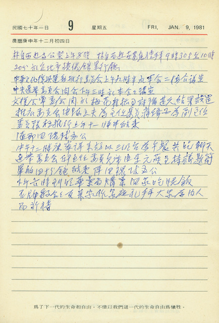本件為吳三連1981年1月9日之日記。吳三連本日上午出席中華文化復興運動推行委員會會議,討論有關梅花運動推廣事宜,中午與康寧祥會晤,下午出席中央選舉委員會會議,晚間與石牌教會會友一同為妻子李菱祈禱。   日記中提及的「中華文化復興運動推行委員會」(簡稱文復會)成立於1967年,為今「中華文化復興運動總會」(簡稱文化總會)前身,其成立宗旨為發揚傳統中華文化與倫理道德,而吳三連為時任文復會委員。此外,「梅花運動」推廣,由文復會底下的「推廣梅花運動委員會」執行,該運動為蔣緯國於1980年底向時任文復會會長嚴家淦等人提出之構想,內容包含組織梅花友好訪問團、舉行國內外以梅花為主題之展覽及活動、協助成立國外梅園會及國內相關團體、加強梅花栽植等等,欲使梅花得以在青天白日旗不便出現之場合,代替中華民國象徵之用,有因應中華民國自1970年代以來的外交失利及穩定政權之企圖。