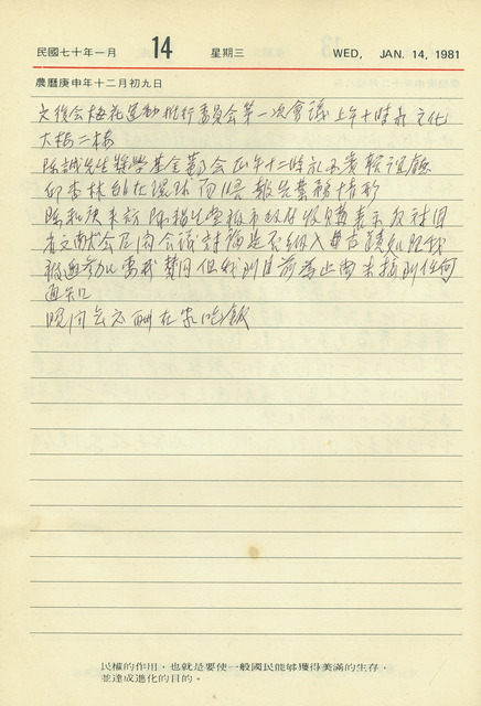 本件為吳三連1981年1月14日之日記。吳三連本日上午參與文復會之「推廣梅花運動委員會」(日記原文記述為「梅花運動推行委員會」)第一次會議;中午於台北國賓大飯店出席陳誠先生獎學基金董事會,之後會晤邱杏林、陳和庚等人。   日記中提及的文復會為「中華文化復興運動推行委員會」簡稱,該會成立於1967年,為今「中華文化復興運動總會」(簡稱文化總會)前身,其成立宗旨為發揚傳統中華文化與倫理道德,而吳三連為時任文復會委員。此外,「推廣梅花運動委員會」為文復會下屬單位,是「梅花運動」主要推手,而該運動為蔣緯國於1980年底向時任文復會會長嚴家淦等人提出之構想,內容包含組織梅花友好訪問團、舉行國內外以梅花為主題之展覽及活動、協助成立國外梅園會及國內相關團體、加強梅花栽植等等,欲使梅花得以在青天白日旗不便出現之場合,代替中華民國象徵之用,有因應中華民國自1970年代以來的外交失利及穩定政權之企圖。