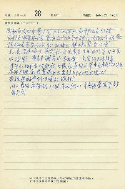 本件為吳三連1981年1月28日之日記。吳三連本日中午與余陳月瑛、黃余綉鸞會晤於環球水泥公司,下午與李雅樵會晤,之後於台北國賓大飯店四香園宴請李海天等人。晚間,因妻子李菱發燒,而請蔡文哲醫師到府診察。   日記中所提及的蔡醫師,為吳三連家庭醫師蔡文哲,而蔡氏夫人為吳蕙,吳蕙之兄長為小兒科醫師吳物典。蔡氏與吳三連一家極為熟識,可謂世交,吳三連晚年多由其照料健康,而從吳三連日記中亦經常可見吳家人身體欠佳時,請蔡醫師來診或至蔡診所就醫之記載。   又,李海天(1923-2013),河北省武清縣人,先後在日本中央大學及明治大學取得法學碩士學位,並獲頒美國紐約聖若望大學榮譽法學博士學位,為華僑協會總會資深顧問。曾任監察委員、立法委員、僑務委員、國家統一委員會委員、總統府國策顧問等要職,同時亦為資深中國國民黨黨員,並曾任第十三至十五屆中央委員,以及中央評議委員會主席團主席。長年旅居日本,在日本創立龐大龍門商業集團,以及成立蔣經國中日文化基金會資助日本留學生,為重要的日本僑領之一。從吳三連日記中,可知其與李海天關係友好,如1981年8月李氏親自邀約其出席位於日本橫濱的飯店落成典禮並致詞,而其亦於同年9月為此前往日本赴約。