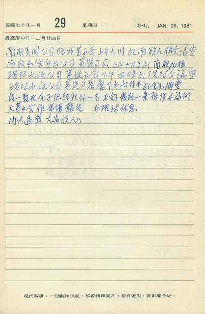 本件為吳三連1981年1月29日之日記。吳三連本日上午出席南聯國際貿易公司之美國分公司臨時董事會,與總公司董監事會,下午出席環球水泥公司董監事會與董監事聚餐。此外,其亦與統一製衣公司總經理會晤。同時,妻子李菱病況好轉。   統一製衣公司,成立於1971年2月,由吳三連與日本伊藤忠商業株式會社合作組織,主要銷售襯衫,並由吳三連擔任董事長,日方派任總經理。於吳三連1981年日記中,常見本日提及的該公司時任總經理金子瑛二來訪與報告業務。又,於同年9月日記中,吳三連曾提及統一製衣因受全球經濟不景氣影響而有虧損情形。