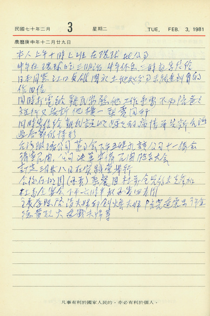 本件為吳三連1981年2月3日之日記。吳三連本日上午於環球水泥公司辦公,下午寫信予日本友人與三子吳凱民,同時亦致電予吳凱民。之後,其參與台灣玻璃公司董事會,以及杜萬全於台北國賓大飯店四春園舉行之宴會,而宴會主賓有出身高雄陳家之陳啟清,以及時任內政部部長邱創煥。   日記中提及的環球水泥公司,簡稱環球、環泥,成立於1959年,為吳三連、侯雨利、吳修齊、吳尊賢等人發起籌建。1960年奉准登記為公司組織,吳三連為首任董事長,先後投資國賓大飯店、自立晚報、南聯國際貿易公司、統一租賃公司等,為臺南幫早期企業群中重要的一股力量。此外,從吳三連日記中可顯見當時政商界綿密的關係網絡,如本日記中提及的陳啟清為日治時期南臺灣巨賈陳中和第八子,與前臺灣省議會議長、國賓大飯店投資者黃朝琴為連襟,亦與吳三連同為南山人壽董事,而其兄長陳啟川與吳修齊為兒女親家。