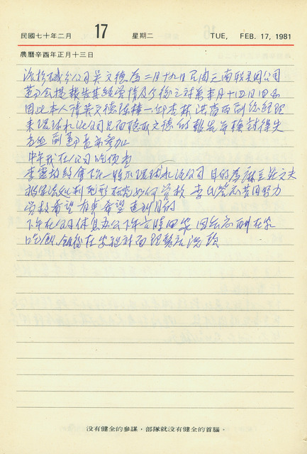 本件為吳三連1981年2月17日之日記。吳三連本日上午與陳樸一、邱杏林等人於環球水泥公司,聆聽吳文德報告南聯國際貿易公司之美國洛杉磯分公司經營情形;下午與李廉(李靈均)商討如何營救遭臺灣警備總司令部軍法處判處死刑之莊文夫;晚間回家晚餐後,於自宅對面理髮店洗頭。   本日提及的莊文夫為陸軍軍法組軍官,據吳三連1981年1月16日之日記,莊氏因涉嫌收賄被判處死刑,所以其親戚李相助自該年1月起,數次與吳三連商討營救事宜,而吳三連亦都表示盡力而為。除與本日提及的李廉商討外,吳三連於同年4月亦曾向時任副總統謝東閔請求協助。最後,於同年6月底,李相助與莊文夫母親再次為莊文夫案拜訪吳三連時,向其告知此案已被駁回更審,有望免除死刑。又,從營救莊文夫過程中,可從中窺見吳三連熱心助人的一面。