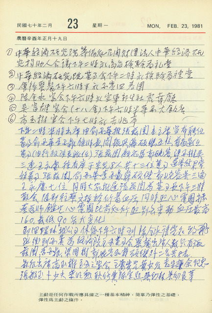 本件為吳三連1981年2月23日之日記。吳三連本日下午出席中華經濟研究院籌備處董事會;會後前往蔡文哲診所健康檢查;晚間赴前中華民國空軍上校陳金水之宴會致謝;參與中華經濟研究院籌備處董事會於台北國賓大飯店舉行之聚餐,以及高玉樹於吉兆亭之宴會。   中華經濟研究院,簡稱中經院,成立於1981年7月1日,由行政院指示經濟建設委員會輔導策劃,為經濟研究機構,是當局為因應1979年中華民國與美國斷交後,所提出之「財政經濟改革措施」,由政府撥款與工商界捐助,共同延攬國內外學者專家,研究國內外經濟情勢,以供政策參考。吳三連本日即參與該研究院籌備期間之工商界捐助會議。除了中經院外,從吳三連日記中亦常見其參與官方、半官方、民間等經濟、工商組織,如中華民國工商協進會、中日文化經濟協會(今台日文化經濟協會)等,可顯見其當時於政、商界有一定的地位。