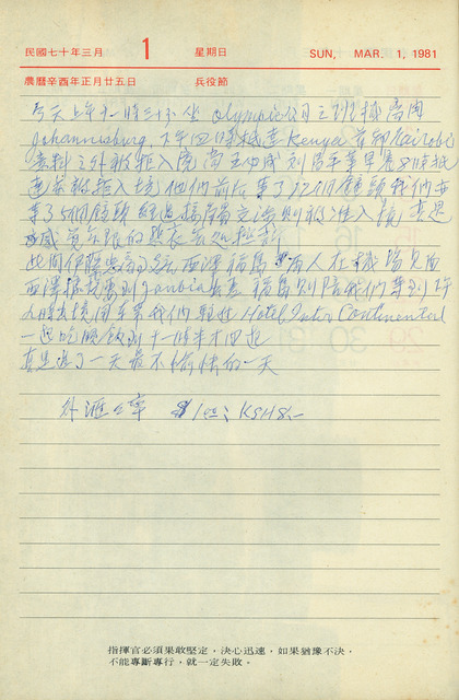 本件為吳三連1981年3月1日之日記。吳三連為參與國際新聞協會(International Press Institute,簡稱IPI)第三十屆會員大會,本日與長女吳梨雪夫婦一同從南非共和國Johannesburg(約翰尼斯堡,簡稱約堡)搭機前往Nairobi(奈洛比),但歷經5小時交涉才被許可入境,並因無法控訴,自覺悲哀。之後,由日本伊藤忠商事株式會社分公司員工福島陪同出境、入住Hotel Inter Continental(洲際酒店及度假村)及晚餐。   日本伊藤忠商事株式會社,由伊藤忠兵衛創業於1858年,主要販售麻布。1949年正式成立公司組織,目前在全球63個國家擁有約110個據點,事業版圖遍及纖維、機械、金屬等各種產業。1958年亦於臺灣設立據點,為今台灣伊藤忠公司,而吳三連長子吳逸民曾於1964年至1981年服務於此。又,該公司於1971年2月,曾與吳三連合作組織統一製衣公司,主要銷售襯衫,並由吳三連擔任董事長,日方派任總經理,可從中窺見吳三連與該公司的緊密關係。