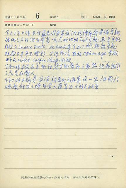本件為吳三連1981年3月6日之日記。吳三連當前正與長女吳梨雪夫婦一同前往非洲肯亞共和國(簡稱肯亞),參與國際新聞協會(International Press Institute,簡稱IPI)第三十屆會員大會。本日受日本伊藤忠商事株式會社(簡稱日本伊藤忠)分公司員工接待,本欲前往博物館欣賞在地文物,但因該館停電,所以改至鄰近的公園與動物園參觀;晚間又與該社分公司員工西澤與福島一同於海鮮店用餐。   從吳三連日記中可知,本次從2月底至3月中的非洲旅行,吳三連一家主要受日本伊藤忠員工接待,而於3月1日至8日間,其停留肯亞首都奈洛比期間,主要受本日提及的西澤、福島兩位職員招待,如本日所提的參觀行程。   又,日本伊藤忠,由伊藤忠兵衛創業於1858年,主要販售麻布。1949年正式成立公司組織,目前在全球63個國家擁有約110個據點,事業版圖遍及纖維、機械、金屬等各種產業。1958年亦於臺灣設立據點,為今台灣伊藤忠公司,而吳三連長子吳逸民曾於1964年至1981年服務於此。又,該公司於1971年2月,曾與吳三連合作組織統一製衣公司,主要銷售襯衫,並由吳三連擔任董事長,日方派任總經理,可從中窺見吳三連與該公司的緊密關係。