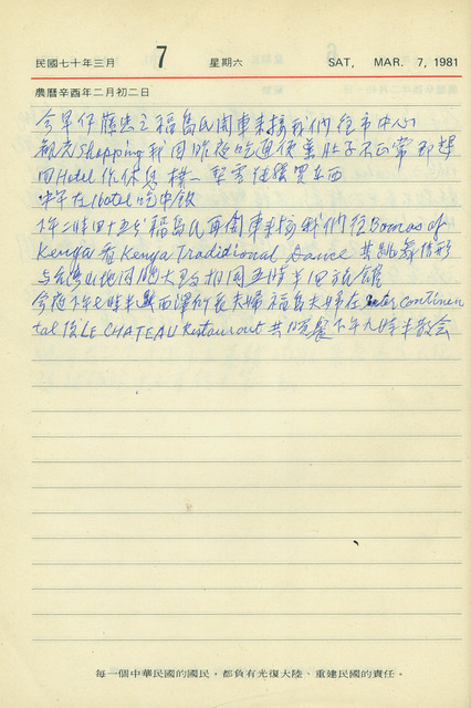 本件為吳三連1981年3月7日之日記。吳三連當前正與長女吳梨雪夫婦一同前往非洲肯亞共和國(簡稱肯亞),參與國際新聞協會(International Press Institute,簡稱IPI)第三十屆會員大會。本日受日本伊藤忠商事株式會社(簡稱日本伊藤忠)分公司員工福島接待,前往肯亞市中心觀光購物,但過程中因身體不適返回旅館休息。下午又受邀欣賞肯亞傳統舞蹈;晚間與伊藤忠分公司員工西澤與福島一同晚餐。   從吳三連日記中可知,本次從2月底至3月中的非洲旅行,吳三連一家主要受日本伊藤忠員工接待,而於3月1日至8日間,其停留肯亞首都奈洛比期間,主要受本日提及的西澤、福島兩位職員招待,如3月6日前往位於奈洛比國家公園(Nairobi National Park)中的國立動物園(Nairobi Animal Orphanage)欣賞動物,以及本日的觀光行程等。   又,日本伊藤忠,由伊藤忠兵衛創業於1858年,主要販售麻布。1949年正式成立公司組織,目前在全球63個國家擁有約110個據點,事業版圖遍及纖維、機械、金屬等各種產業。1958年亦於臺灣設立據點,為今台灣伊藤忠公司,而吳三連長子吳逸民曾於1964年至1981年服務於此。又,該公司於1971年2月,曾與吳三連合作組織統一製衣公司,主要銷售襯衫,並由吳三連擔任董事長,日方派任總經理,可從中窺見吳三連與該公司的緊密關係。