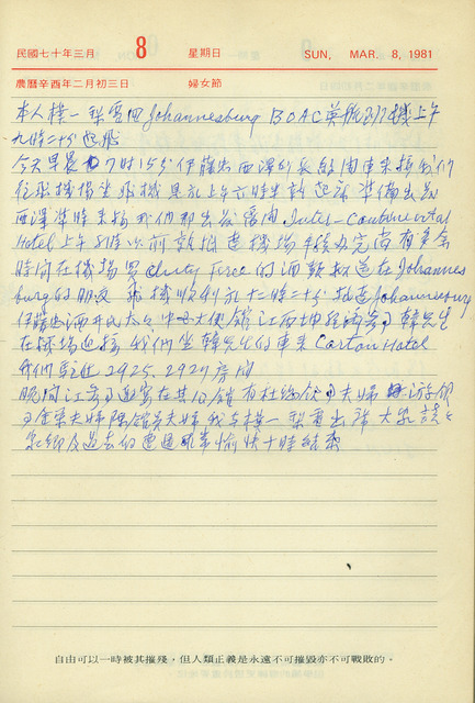本件為吳三連1981年3月8日之日記。吳三連當前正與長女吳梨雪夫婦一同前往非洲肯亞共和國(簡稱肯亞),參與國際新聞協會(International Press Institute,簡稱IPI)第三十屆會員大會。本日與長女吳梨雪夫婦由日本伊藤忠商事株式會社(簡稱日本伊藤忠)分公司員工西澤送往機場,準備搭機前往南非共和國(簡稱南非)Johannesburg(約翰尼斯堡,簡稱約堡)。抵達約堡後,由時任中華民國駐南非大使館經濟參事處經濟參事江丙坤一行人接機,晚間與大使館員工一同於江氏宅邸晚餐。   從吳三連日記中可知,本次從2月26日至3月17日的非洲旅行,吳三連一家主要受日本伊藤忠員工接待,於約堡期間主要由本日提及的該公司ヨハネスブルグ支店長酒井招待,而於肯亞首都奈洛比期間(3月1日至8日)主要由ナイロビ駐在員事務所所長西澤與員工福島招待。   此外,時任中華民國駐南非大使館之大使楊西崑、總領事杜元方,以及本日所提的江丙坤等人,亦於吳三連一行人於約堡期間多次招待,其中江丙坤更幾次擔任司機接送角色。   又,江丙坤(1932-2018),為戰後臺灣外交與經貿界重要人物。1971年取得日本東京大學農經博士,1974年任中華民國駐南非約堡總領事館商務專員處商務專員,1979年任駐南非大使館經濟參事處經濟參事。1982年被調派回國,擔任經濟部國際貿易局副局長,之後歷任中國國民黨第一副主席、國際民主聯盟副主席、立法院副院長、經濟部部長、行政院經濟建設委員會主任委員、財團法人海峽交流基金會(簡稱海基會)董事長等職。2008年任海基會董事長期間,曾率團至中國與海峽兩岸關係協會恢復中斷九年的兩會談判。