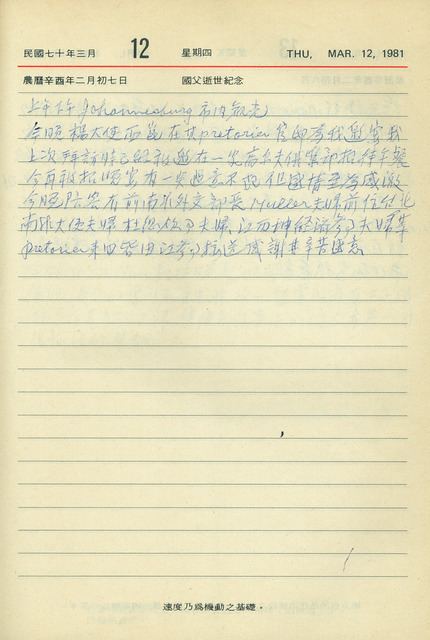 本件為吳三連1981年3月12日之日記。吳三連先前與長女吳梨雪夫婦剛結束於非洲肯亞共和國舉行之國際新聞協會(International Press Institute,簡稱IPI)第三十屆會員大會,現正於南非共和國(簡稱南非)Johannesburg(約翰尼斯堡,簡稱約堡)旅遊。本日上、下午,吳三連皆於約堡市內觀光;晚間受邀至時任中華民國駐南非大使楊西崑官邸參與晚宴,而與會來賓有前南非外交部長、前南非駐臺北大使、駐南非大使館員工等人。此外,其本日往返楊氏官邸皆由時任駐南非大使館經濟參事處經濟參事江丙坤接送,因此於日記中對江氏表示感激。   從吳三連日記中可知,本次從2月26日至3月17日的非洲旅行,吳三連一家於約堡期間多次受中華民國駐南非大使館職員招待,如本日提及的楊西崑、江丙坤等人,其中江丙坤更幾次擔任司機接送角色,如2月27日吳三連抵達約堡第二天,以及本日所提等。   又,本日提及的楊西崑(1910-2000)為中國江蘇人,畢業於中國北京大學外文系後,曾赴美國哥倫比亞大學進修,為中華民國資深外交官。1948年任駐聯合國代表團專門委員。1952至1955年任聯合國託管理事會西非訪問團委員,之後歷任外交部駐南非代表、亞太司長、非洲司長、常務和政務次長及國策顧問。因對非洲事務熟悉,有「非洲先生」之稱。