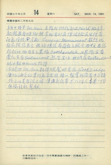 本件為吳三連1981年3月14日之日記。吳三連先前與長女吳梨雪夫婦剛結束於非洲肯亞共和國(簡稱肯亞)舉行之國際新聞協會(International Press Institute,簡稱IPI)第三十屆會員大會,現正於南非共和國(簡稱南非)Cape Town(開普敦,南非首都)旅遊。其本日由友人Mr. Han接待至開普敦郊區參觀知名景點,晚間亦受其招待晚宴,與會者有長女吳梨雪夫婦、時任中正國際機場(今臺灣桃園國際機場)航空站主任董孝誼夫婦、中華民國駐開普敦副領事傅迪等八人。   本次從2月26日至3月17日的非洲旅行,吳三連一家主要活動於南非約堡、肯亞奈洛比(3月1日至8日)、南非開普敦(3月13日至16日)三地。從日記中可知,除3月2日與3日於奈洛比全程參與第三十屆國際新聞協會會員大會外,吳三連一家主要從事觀光與社交活動,如本日由友人Mr. Han(或稱韓先生)熱情陪同觀光與設宴款待。又,Mr. Han為吳三連旅行開普敦期間,最主要的陪同與接待者。   再者,本次整體非洲旅行過程中,吳三連一家主要由日本伊藤忠商事株式會社於約堡與奈洛比的職員接待,如酒井、西澤等人,並派車供吳三連一家外出使用,其次亦有幾次受中華民國駐南非大使館職員招待,如駐南非大使楊西崑等人。