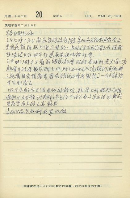 本件為吳三連1981年3月20日之日記。吳三連本日上午於總統府參與國父紀念月會後,赴環球水泥公司辦公;中午於長子吳逸民家用餐與休息;下午與前副總統嚴家淦會晤,並告報非洲之行觀感;下午原安排與國立臺灣大學醫學院附設醫院眼科部洪醫師約診治療,卻因自己遲到而有失約之感。