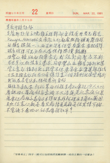 本件為吳三連1981年3月22日之日記。吳三連本日上午於自立晚報社主持幹部座談會,並先後報告於非洲行的觀感與聆聽羅祖光、吳豐山等業務報告。之後,其至長子吳逸民家,為妻子李菱慶祝七十七歲誕辰,與會者有李菱兄弟李增禮及其孫子,以及曾受其資助之畫家陳永森等人。此外,其於日記文末表示,雖歡喜看待李菱病情,但仍因憐憫落淚。   《自立晚報》由顧培根創辦於1947年,為臺灣第一份晚報,曾歷經數次改組,亦因政治因素遭停刊三次,並於解嚴後,因不堪媒體市場競爭激烈而於2001年正式停刊。早年因經營困難,數次易主,於1959年第三次改組後,吳三連任常務董事長兼發行人,並秉持以「無黨無派、獨立經營」之理念,對中壢事件、美麗島事件等皆有詳實報導,曾獲得大眾不少支持。   於吳三連日記中,常見其提及參與該報有關會議,並可窺見其對報社經營理念,以及對報導內容的品質重視,如本日提及新聞製造需與時俱進,又如1981年8月對馬榮祥請求刊登司法不公一事,表示需待監察院展開調查後才能報導,以及1988年3月受時任中國國民黨中央委員會黨史委員會主任委員秦孝儀指控報導不實之時,表態願意親自道歉以示負責等。