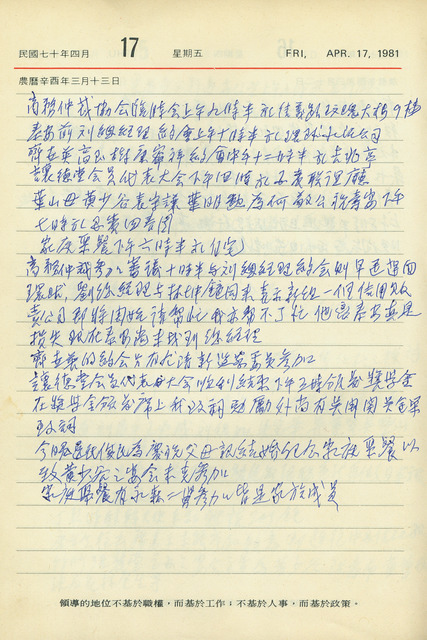 本件為吳三連1981年4月17日之日記。吳三連本日上午參與中華民國商務仲裁協會(今中華民國仲裁協會)臨時會後,與泰安產物保險公司前總經理劉錦榮會晤於環球水泥公司;中午與康寧祥等人於吉兆亭會晤;下午出席讓德堂會員代表大會,以及頒發獎學金;晚間長子吳逸民與四子吳俊民為其慶祝結婚紀念,與會者尚有妻子李菱二舅陳永森。   日記中提及的泰安產物保險公司,創立於1961年,簡稱泰安產險,由當時社會仕紳、知名醫師與企業家等共同集資組成,為臺灣早期成立的民營產物保險公司之一。前臺北市(省轄市)第二屆市長游彌堅為首任董事長,劉啟光、郭宗煥、何傳、吳火獅、陳勇、簡五朝等六人為首屆常務董事,林坤鐘為首任總經理。該公司開業至今,經營業務範圍包括汽車保險、住家保險、商業火險、工程保險、責任保險、運輸保險、船航保險、傷害保險、健康保險等。吳三連當時亦為該公司股東,並常見其於日記中提及出席董監事會或常務董事會之事。