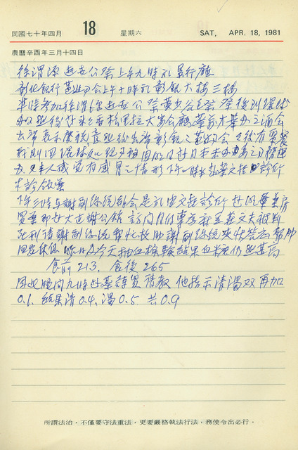 本件為吳三連1981年4月18日之日記。吳三連本日上午出席遠東集團創始人徐有庠之弟徐渭源逝世公祭;祭後回環球水泥公司辦公;赴來來香格里拉大飯店(今台北喜來登大飯店)參與時任第一屆第三次增額立法委員蔡萬才之酒會;赴彰化銀行董監事會;回環球水泥公司辦公。下午因有感冒症狀,先至蔡文哲診所求診,之後赴時任副總統謝東閔宅邸,為莊文夫官司請求協助。晚間因血糖異常,向蔡詩賢醫師請教。   本日提及的莊文夫為陸軍軍法組軍官,據吳三連1981年1月16日之日記,莊氏因涉嫌收賄被判處死刑,所以其親戚李相助自該年1月起,數次與吳三連商討營救事宜,而吳三連亦都表示盡力而為。本日為4月12日商討後,吳三連向時任副總統謝東閔求助的實際行動。最後,於同年6月底,李相助與莊文夫母親再次為莊文夫案拜訪吳三連時,向其告知此案已被駁回更審,有望免除死刑。從營救莊文夫過程中,可窺見吳三連熱心助人的一面。