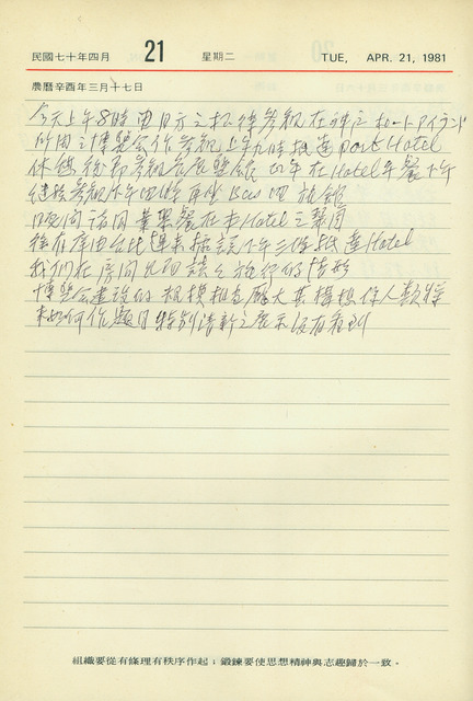 本件為吳三連1981年4月21日之日記。吳三連本日由日本代表招待,參觀日本神戶ポートアイランド(中譯為港灣人工島)博覽會,會後於旅館用餐;下午行程結束後返回旅館;晚間與同業於旅館內聚餐,之後與徐有庠談論旅行見聞。   吳三連為參與1981年4月20日舉行的「中日棉紡業懇談會」,於4月19日搭機前往日本,並於5月10日返臺。從日記中可知,該會應為臺灣與日本兩地的紡織業交流活動,並由日方主辦,因此可見吳三連提及有關日方招待行程,如本日所提的參觀博覽會。   又,日記中提及的徐有庠,為遠東集團創始人,與吳三連同為臺灣早期具代表性的紡織實業家之一。