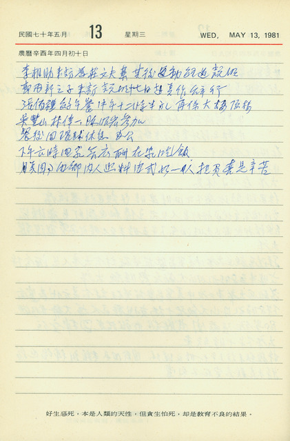 本件為吳三連1981年5月13日之日記。吳三連本日上午與李相助、郭雨新之子郭時南等人會晤;中午與張伯謹等人一同午餐;餐後回環球水泥公司休息與辦公;晚間無應酬,於家裡用餐。又,由於親戚王月美因事回家鄉,所以其妻子李菱僅由四子吳俊民之妻謝式如一人照顧,對此深感四媳辛勞。   本日提及的莊文夫為陸軍軍法組軍官,據吳三連1981年1月16日之日記,莊氏因涉嫌收賄被判處死刑,所以其親戚李相助自該年1月起,數次與吳三連商討營救事宜,而吳三連亦都表示盡力而為,更於同年4月向時任副總統謝東閔請求協助。最後,於同年6月底,李相助與莊文夫母親再次為莊文夫案拜訪吳三連時,向其告知此案已被駁回更審,有望免除死刑。又,從營救莊文夫過程中,可從中窺見吳三連熱心助人的一面。