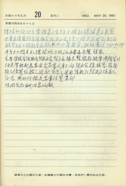 本件為吳三連1981年5月20日之日記。吳三連本日上午出席環球水泥公司常務董事會;下午出席中華民國團結自強協會理監事會,會中以基金會召集人身分向理事會報告資金事宜;晚間無應酬,回家晚餐。   日記中提及的中華民國團結自強協會成立於1980年,乃為因應1979年臺美斷交後臺灣在外交上的失利,而由學術界領袖端木愷、蔣彥士等人;工商企業界王永慶、辜振甫;新聞傳播界吳三連、馬星野等人;宗教界蕭永泰、白盛等人發起,以協調相關單位共同在海內、外推動團結自強運動為宗旨。成立初期,由時任東吳大學校長端木愷出任理事長,吳三連為副理事長,沈君山為秘書長。後因端木愷長年臥病,由吳三連擔任幾年代理理事長,直至1984年2月才正式擔任理事長。該會在吳三連主持期間蓬勃發展,並在協助海外「黑名單」返國一事上不遺餘力,因為吳三連認為團結海內、外同胞,有助於凝聚國家向心力。