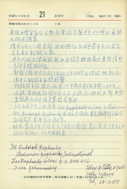 本件為吳三連1981年5月21日之日記。吳三連本日上午與關中會晤;中午出席南聯國際貿易公司幹部座談會;會後至環球水泥公司休息,並與郭哲等人會晤;晚間出席Leo Raphaely & Sons主席於台北圓山大飯店之酒會,以及林忠於福星川菜館舉行之宴會。   日記中提及的關中,於1981年4月底甫卸任中國國民黨中央政策委員會副秘書長一職,改任中國國民黨臺北市黨部主任委員,而郭哲則為接替關中副秘書長職位之人,即吳三連提及的「新任關中之職」之事。又,從關中與郭哲二人於職務交替之際拜訪吳三連,可從中窺見無黨籍的吳三連,為中國國民黨當局敬重之人,以及其為重要「中間人」之地位,如1979年12月10日發生美麗島事件後,時任中國國民黨中央政策委員會副秘書長關中於隔日即致電吳三連,希望其提供協助等。