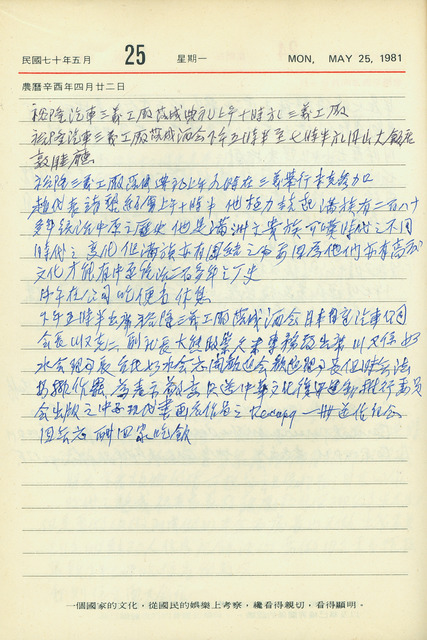 本件為吳三連1981年5月25日之日記。吳三連本日上午與第一屆國大代表趙靖黎會晤,趙氏為滿洲貴族後裔,因此向其感嘆時局變化;中午在公司午餐與休息;下午赴台北圓山大飯店敦睦廳出席裕隆汽車三義工廠落成酒會,並提及因臺北如水會未能歡迎時任日產汽車公司會長兼日本如水會理事長川又克二,所以贈送中國現代書畫名作品予其以表歉意;晚間無應酬,回家用餐。   日記中提及的川又克二,除了是當時日產汽車公司會長兼日本如水會理事長外,亦是吳三連日本東京商業大學(今一橋大學)學弟,又「如水會」為該校校友會,成立於1889年,原稱「高等商業學校同窗會」、「日本高等商業學校同窗會」,後於1914年正式改名如水會,並於1916年正式成立社團法人,而其成立宗旨為「支援母校」,致力協助母校實踐目標與使命,並促進政治經濟與社會文化發展。除了日本本國外,亦在海外有諸多分會。從吳三連日記中,經常可見其與大學校友的商業往來與人際互動,可從中窺見如水會是個極具向心力的同窗社團。