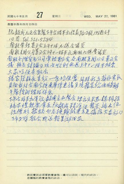 本件為吳三連1981年5月27日之日記。吳三連本日上午參與南聯國際貿易公司常務董事會及南聯美國公司董事會;中午與時任臺南縣長楊寶發一同午餐,餐後回環球水泥公司休息;晚間出席由前制憲國民大會代表阮毅成主辦的「九老會」聚餐,會後送第一屆立法委員賴景瑚回家。   日記中提及的「九老會」主要成員有余井塘、王雲五、程滄波、阮毅成、陶百川、成舎我、樓桐孫、范爭波、吳三連等九人,多為當時政治界與新聞媒體界的要人,於吳三連日記中常見該會有關敘述。除主要成員外,聚會中亦常見其他政界名流出席,如本日記中提及的陳立夫、賴景瑚(賴璉)等人,可從中窺見當時政治界的關係網絡,以及吳三連交友圈。