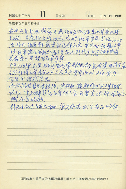 此為吳三連1981年6月11日之日記。吳三連本日上午先至明華藥局買藥,再赴前退輔會主任委員趙聚鈺靈堂致意,並因《大華晚報》刊登的靈堂地址不實,深感準確報導的重要性。中午出席中華民國高爾夫協會常務理監事會,會中通過周至柔連任主席一事,會後回環球水泥公司休息。之後,聆聽總經理顏岫峰與秘書沈邦頎業務報告。傍晚至台北國賓大飯店地下室理髮室洗頭,晚間無應酬,回家用餐。   從吳三連日記中,常見其閒暇時至高爾夫球場打球,除了將高爾夫視為休閒運動外,其亦長期投入有關單位,如本日記中提及的中華民國高爾夫協會。   中華民國高爾夫協會前身為日治時期位於淡水的台灣高爾夫俱樂部;戰後,於1953年,在何應欽、孫連仲、吳三連、陳重光等人的倡議下,組織「台北高爾夫俱樂部」,選址於臺北市南機場(今青年公園),同年10月動工,1954年10月正式啟用,後遷至林口。1956年6月成立「中華全國高爾夫委員會」,後因應國內體育團體組織法之施行,於1977年改組為「中華民國高爾夫協會」。此外,要特別說明的是,吳三連喜好高爾夫球,於臺北市長卸任後,在1964年邀請工商界好友許金德、謝成源、林燈、賴森林等人籌組創立「台北縣林口高爾夫俱樂部」,1965年8月正式完工啟用,同年9月經濟部核准「林口高爾夫俱樂部股份有限公司」經營執照。1983年改組為「林口育樂事業股份有限公司」後,開始以正規公司制度營運,吳三連為第一屆董事長,而此與前述之球場、協會皆為各自獨立運作之組織。