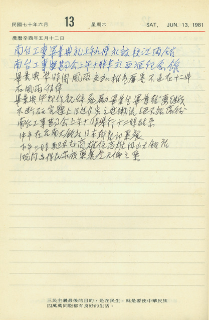 本件為吳三連1981年6月13日之日記。當天吳三連與次子吳得民一家至南部旅遊。本日上午,吳三連先於南臺工專(今南台科技大學)江雨堂(今三連堂)參與第十一屆五年制學生畢業典禮,並致詞勉勵畢業生,之後出席南臺工專董事會;中午至台南大飯店午餐;下午赴高雄圓山大飯;晚間與吳得民全家聚餐。   從吳三連日記中,常見其對教育、藝文事業的關懷與支持,甚至辦校力行,如臺南天仁高級工商職業學校,以及本日記中提及的南臺工專。   南臺工專成立於1964年,由吳三連邀請臺南地方人士:辛文炳、侯雨利、吳修齊、吳尊賢等人籌設,以培育工商人才為目標,並以辦理第一流的專科學校為職志。1969年正式創校,原名為私立南臺工業技藝專科學校;1972年獲准成立五年制工專,改名為私立南臺工業專科學校;1990年陸續增設商業類科,改名為私立南臺工商專科學校;1996年因積優專科學校得聲請改制為技術學院政策明朗化,該校亦提出申請,並改制成為南臺技術學院;1999年獲教育部核准升格,更名為南臺科技大學。日記中提及的「江雨堂」,為1981年興建的禮堂體育館,並以吳三連字「江雨」命名,2000年修建時更名為「三連堂」。
