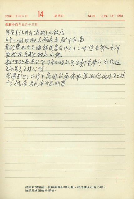 本件為吳三連1981年6月14日之日記。吳三連本日上午從高雄圓山大飯赴臺南參與吳修齊宴會,之後至台南大飯店休息。下午出席劉博物逝世公祭,並以主任委員身分主持公祭,祭畢離開臺南,返回臺北。   日記中提及的「台南大飯店」,由旅日華僑鄭旺與鄭添根兄弟創辦於1963年,並於1964年開幕,為當時南臺灣第一家國際觀光飯店,而在吳三連日記中,常見其於臺南出差時下榻於此,以及與友人在此聚餐、商討公事。此外,從其1981年2月15日日記中,亦可知當時臺南幫領導者之一的侯雨利之長孫侯博義,亦於此舉行婚宴,可窺見當時該飯店於臺南地區的知名度與重要性。