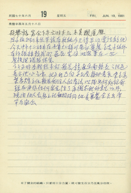 本件為吳三連1981年6月19日之日記。吳三連本日中午與小坂正則、許振緒等人一同於台北國賓大飯店川菜部午餐;餐後回環球水泥公司休息;下午與時任《自立晚報》社長李雅樵會晤;晚間出席林攀龍主辦的「舊人會」宴會,並表示本次罕見全員出席。   從吳三連1981年5月以來的日記中,常見其為爭取國民黨提名李雅樵競選第九屆臺南縣長努力奔走之記述,如本日提及已向時任國民黨中央委員會秘書長蔣彥士、臺灣省黨部主任委員宋時選、中央委員會組織工作會主任梁孝煌等高層進言。不過,國民黨最終仍提名時任臺南縣長楊寶發競選連任,之後才由李氏繼任縣長。據張麗堂訪談錄,吳三連與李雅樵於本次選舉中如此積極行動,與國民黨為平衡地方派系,曾失信提名李氏有關。