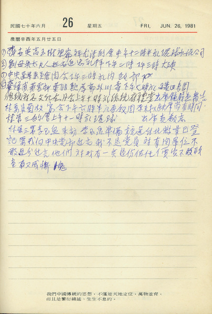 本件為吳三連1981年6月26日之日記。吳三連本日上午於總統府參與國父紀念月會;和林榮三與李玉泉會晤於環球水泥公司;晚間出席時任中央選舉委員林菊枝宴會。此外,本日尚有與齊世英等人約會、吳太夫人逝世追思禮拜、中央選舉委員會開會、辜偉甫等人晚宴等行程,但未知是否皆有出席。   日記中提及的中央選舉委員會,簡稱中選會,成立於1980年6月16日,其組織法源依據為1980年5月14日所公布之《動員戡亂時期公職人員選舉罷免法》,主要任務為與各地方選舉委員會共同負責辦理各項選舉。從吳三連日記中經常可見有關中選會之記載。1980年6月,中選會成立之初,吳三連即被奉派為十五名委員之一。又從李玉泉為爭取競選拜訪吳三連之事,亦可見吳三連的民間領袖角色,在臺灣社會中仍有相當程度的影響力。