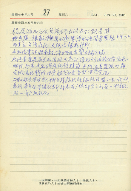 本件為吳三連1981年6月27日之日記。吳三連本日中午與徐有庠、張敏鈺一同宴請水泥同業,商討水泥業當前困境,並初步擬定有關對策。下午出席九和汽車公司股東會,會中由該公司創辦元老宗仁卿主持、總經理孫照臨報告業績。晚間於敘香園參與程滄波主辦的九老會聚餐。   吳三連於1959年與侯雨利、吳修齊、吳尊賢等人為因應當時政府欲加速工礦業發展、擴大出口貿易、擴大工業基礎等政策,而發起籌建環球水泥公司(簡稱環球)。日記中經常可見有關該公司與水泥產業的記載,可從中窺見1960年代以來臺灣水泥產業與經濟發展脈絡,而環球亦是吳三連時常與友人會晤、商討事宜的場所。此外,日記中提及的「九老會」主要成員有余井塘、王雲五、程滄波、阮毅成、陶百川、成舎我、樓桐孫、范爭波、吳三連等九人,多為當時政治界與新聞媒體界的要人,於吳三連日記中亦常見該會有關敘述。
