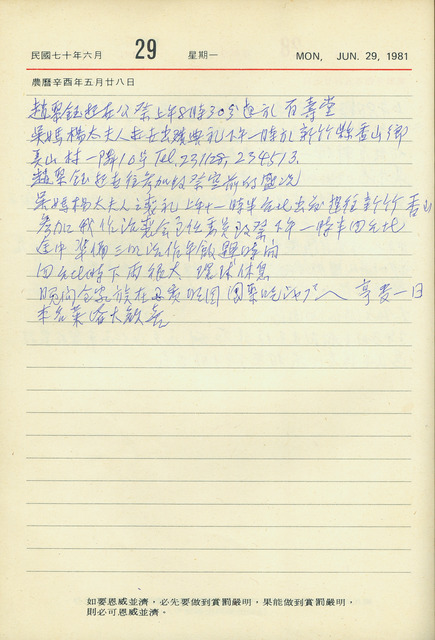 本件為吳三連1981年6月29日之日記。吳三連本日上午先出席前退輔會主任委員趙聚鈺公祭典禮,之後趕往新竹參與楊太夫人喪禮,並以治喪委員會主任委員身份致祭,祭畢趕回臺北。回臺北途中以三明治當午餐,並適逢大雨。抵達臺北後,先至環球水泥公司休息,晚間與全家族至台北國賓大飯店明園聚餐。   從吳三連日記中常見其出席政商名流之逝世公祭,以及擔任治喪委員會主任委員,可從中窺見其於政壇與商界的人脈廣闊與影響力。此外,日記中亦常見其與家人聚餐與聚會之記述,尤其是於家人生日、家人來訪、特殊紀念日,或是子女返臺、離臺等特殊節日,亦常見其特別取消應酬,參與或舉行聚會,可從中窺見其對家庭關係的重視與經營,如1981年6月次子吳得民全家與五子吳樹民全家返臺期間,不僅常見家族聚餐之事,亦常見互動情形之記述。再者,次子吳得民自1960年代移居美國,又因其被國民黨當局列為「黑名單」,直至1980年代前,長期無法返臺。1970年代,國民黨為鞏固其執政優勢,透過情治系統防範言論的策略,將散播違反「反共國策」,以及提出臺獨言論者都予以管制入境,而當時只要被認定為異議份子,就會被列入黑名單,使得許多臺灣人因此被迫流亡海外。