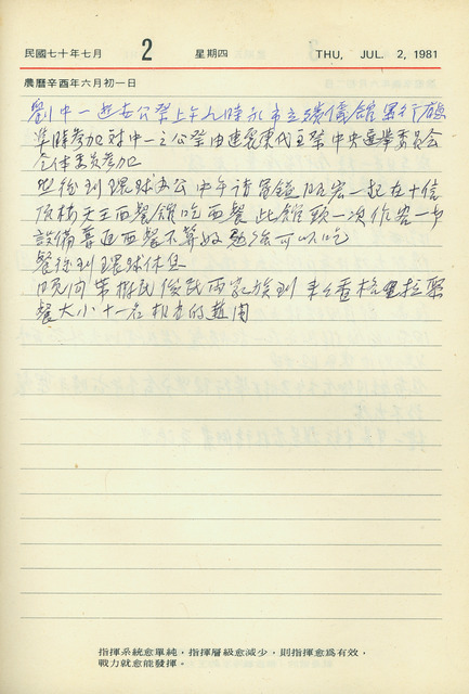 本件為吳三連1981年7月2日之日記。吳三連本日上午出席時任中央選舉委員劉中一公祭;之後回環球水泥公司辦公;中午與秘書趙富鎰、陳昭宏一同於天王西餐館用餐;餐後再回公司休息;晚間與四子吳俊民全家、五子吳樹民全家赴來來香格里拉用餐。   日記中提到的中央選舉委員會,簡稱中選會,成立於1980年6月16日,其組織法源依據為1980年5月14日所公布之《動員戡亂時期公職人員選舉罷免法》,主要任務為與各地方選舉委員會共同負責辦理各項選舉。從吳三連日記中經常可見有關中選會之記載,而於1980年6月,中選會成立之初,吳三連即被奉派為十五名委員之一。