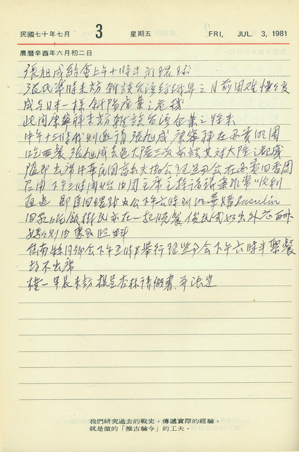 本件為吳三連1981年7月3日之日記。吳三連本日上午與長女婿陳樸一、時任美國賓州州立大學政治系教授張旭成等人會晤。中午,邀張旭成與康寧祥在國賓明園用餐;餐後於國賓四香園出席中華民國高爾夫協會理監事會;會後回環球水泥公司辦公。晚間,於明華藥局購藥後,回家與五子吳樹民一同用餐,又因四子吳俊民夫婦外出應酬,遂由吳樹民妻子楊惠玉照顧其妻子李菱。   從吳三連日記中常見其與家人聚餐之記述,而於家人生日、與妻子李菱結婚紀念日,或是子女返臺、離臺等特殊節日,亦常見吳三連特別取消應酬,參與聚會,如本日記中提及為與五子吳樹民晚餐,而缺席台北市台南縣同鄉會理監事會即是一例,可從中窺見其對家庭關係的重視與經營。   吳樹民畢業於高雄醫學院(今高雄醫學大學),短暫任職臺北榮民總醫院內科醫師後,於1969年赴美國行醫與任教,而在1988年吳三連逝世後,於隔年回臺定居,並承繼吳三連遺志,投入《自立晚報》事業。