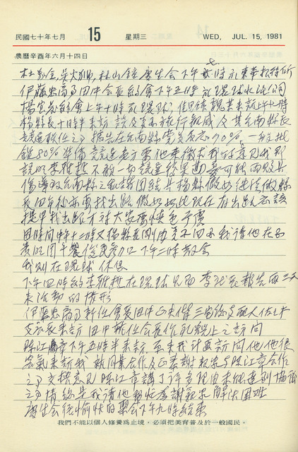 西曆日期:1981/7/15/他類日期:民國70年7月15日