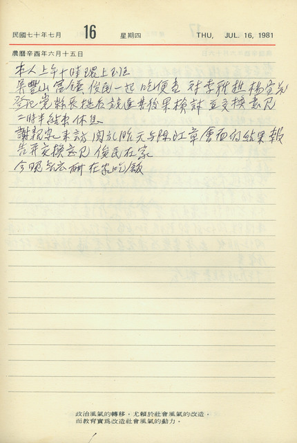 本件為吳三連1981年7月16日之日記。吳三連本日上午於環球水泥公司辦公;中午與時任《自立晚報》總編輯吳豐山等人午餐,並商討時任臺南縣長楊寶發欲參選國民黨臺南縣長提名一事;之後與四子吳俊民之岳父謝敏初會晤,並向謝氏說明昨日與時任東南水泥公司董事長陳江章會晤的結果;晚間因無應酬在家晚餐。   日記中提及的「國民黨臺南縣長提名」一事,從吳三連1981年5月以來的日記,常見其為爭取國民黨提名與支持李雅樵參選,而努力奔走之記載,如向時任國民黨中央委員會秘書長蔣彥士、時任副總統謝東閔等高層提出建言,甚至與時任臺南縣長楊寶發當面協商等。不過,國民黨最終仍提名與支持楊氏競選連任。據張麗堂訪談錄,吳三連與李雅樵於本次選舉中如此積極行動,與國民黨為平衡地方派系,曾失信提名李氏有關。又吳三連向謝敏初說明與陳江章會晤之事,可能與謝氏正泰水泥公司經營權將轉換予陳氏有關。