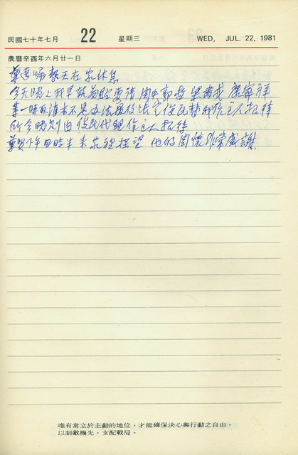 本件為吳三連1981年7月22日之日記。吳三連自1981年7月20日從臺南返回臺北後,即感冒不適至今,而昨日經家庭醫師蔡文哲診察並叮囑需休息後,本日其決定整天在家靜養,因此請四子吳俊民代表出席晚間的宴會,與會貴賓有關中、郭哲、梁肅戎、康寧祥等人。下午,吳尊賢前來探視,其表示非常感謝。   日記中提及的關中為時任國民黨臺北市黨部主任委員,郭哲與梁肅戎同為時任國民黨中央政策委員會副秘書長,三人皆為當時國民黨負責黨外溝通的人士之一,而康寧祥為黨外人士,時任第一屆第二次增額立法委員。本次聚會可能與商討政事有關,而吳三連可能為邀約兩方會晤之中間人士。   又,吳尊賢(1916-1999),今臺南市學甲區人,與吳三連同鄉、同宗,亦與吳三連同為「臺南幫」企業集團第一代領導人之一,於吳三連日記中,常見兩人互動密切,除了商業上的往來外,亦常見吳尊賢於平時拜訪或探望吳三連之記述,如本日所述。