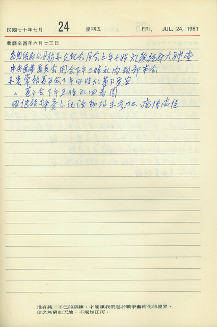 本件為吳三連1981年7月24日之日記。吳三連本日原預定出席總統府國父紀念月會等活動,但其自1981年7月20日從臺南返回臺北後,即感冒不適至今,經家庭醫師蔡文哲診察並叮囑需休息後,7月22日起停止一切外出活動,在家靜養。此外,其本日亦記述病情似乎有好轉。   日記中提及的中央選舉委員會,簡稱中選會,成立於1980年6月16日,其組織法源依據為1980年5月14日所公布之《動員戡亂時期公職人員選舉罷免法》,主要任務為與各地方選舉委員會共同負責辦理各項選舉。從吳三連日記中經常可見有關中選會之記載,而於1980年6月,中選會成立之初,吳三連即被奉派為十五名委員之一。