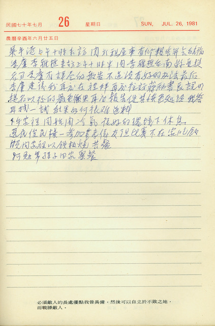 本件為吳三連1981年7月26日之日記。吳三連本日上午先與吳牛港會晤後,與李廉、李雅樵商討國民黨臺南縣長提名一事,而李廉建議再次拜訪蔣彥士,說明此事的嚴重後果;下午於宅邸冷氣房中休息;晚間與長媳吳阿勉和孫子在家聚餐,而長子吳逸民、四子吳俊民、長女婿陳樸一因參與中正國際機場(今桃園國際機場)首任主任董孝誼的活動,未能一起晚餐。   日記中提及的「臺南縣長提名」一事,從吳三連1981年5月以來的日記,常見其為爭取國民黨提名與支持李雅樵參選,努力奔走之記載,如向時任國民黨中央委員會秘書長蔣彥士、時任副總統謝東閔等高層提出建言,甚至和欲競選連任之時任臺南縣長楊寶發當面協商等。然而,繼同年7月15日楊氏向其表態準備競選連任後,7月20日其即聽聞國民黨臺灣省黨部欲正式提名楊氏,而本日時任正聲廣播公司董事長李廉與李雅樵來訪,因與此事有關。不過,國民黨最終仍提名與支持楊氏競選連任。據張麗堂訪談錄,吳三連與李雅樵於本次選舉中如此積極行動,與國民黨為平衡地方派系,曾兩次失信提名李氏競選臺南縣長有關。
