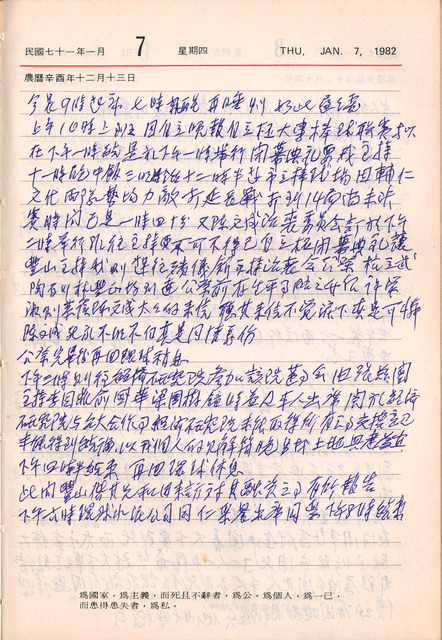 此為吳三連寫於 1982 年 1 月 7 日之日記。吳三連上午至環球,中午過後便赴市立棒球場預備參加自立杯大專棒球聯賽頒獎典禮,然因延長加賽太久,便轉往至陳文成治喪會主持公祭,後再返環球休息。下午至中經院參加董事會,由張茲闓主持,出席者有李國鼎、俞國華、梁國樹、鍾時益等,討論中經院與臺大合作事。後至環球,接待吳豐山與其兄和田,聽取融資之事報告。   中華經濟研究院,於 1981 年 7 月 1 日依據「中華經濟研究院設置條例」正式成立,創立基金為新臺幣十億元,除由中央政府及中美經濟社會發展基金分年共捐助九億元外,其餘一億元由工商界捐助之。 1979 年 1 月,美國與中華民國斷絕外交關係,臺灣當局為因應情勢與確保國家經濟持續穩定,提出「財政經濟改革措施」,以財團法人形式成立獨立研究機構,用以研討國內外經濟情勢,作為國家政策智庫,向政府提出建議供施政參考。