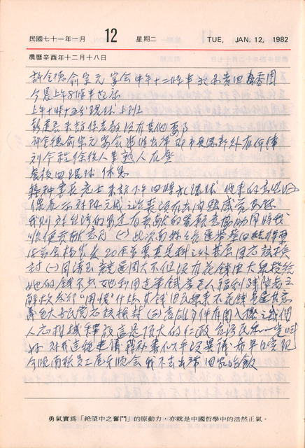 此為吳三連寫於 1982 年 1 月 12 日之日記。上午吳三連至環球上班,接待來訪之彭建吾,彭氏無要事。下午接待國民黨秘書長蔣彥士來訪,表示其樂見陳文成治喪時無意外產生。吳三連向蔣氏提出幾項意見:應檢討臺南縣縣長選舉;周清玉競選國大花費甚少,並將政治捐獻投入社會關懷,國民黨應自我檢討;因美麗島事件下獄者應相繼釋放。   1981 年全臺縣市長選舉,臺南縣縣長得票接近,尋求連任之縣長楊寶發竟與無黨籍挑戰者蔡四結得票率僅差距約 7 個百分點,故吳三連認為國民黨需對其選舉手段或施政作出檢討。   周清玉,姚嘉文之妻,民主進步黨籍,曾任彰化縣長、臺灣省議員、立法委員、國大代表。 1980 年增額國大代表選舉前時逢美麗島事件爆發,丈夫姚嘉文遭收押,受此影響黨外力量凝聚,進而當選國大。   《美麗島》雜誌社在高雄舉辦人權紀念會於 1979 年 12 月 10 日,大批群眾參加,治安單位派出大批鎮暴部隊進行嚴密監視,最後導致場面失控,警民爆發嚴重衝突,「美麗島事件」爆發。警總於事件爆發後以叛亂罪嫌逮捕多名相關人士,黃信介、施明德、姚嘉文……等八名《美麗島》相關人士皆遭收押,後皆受判處 12 年以上有期徒刑。