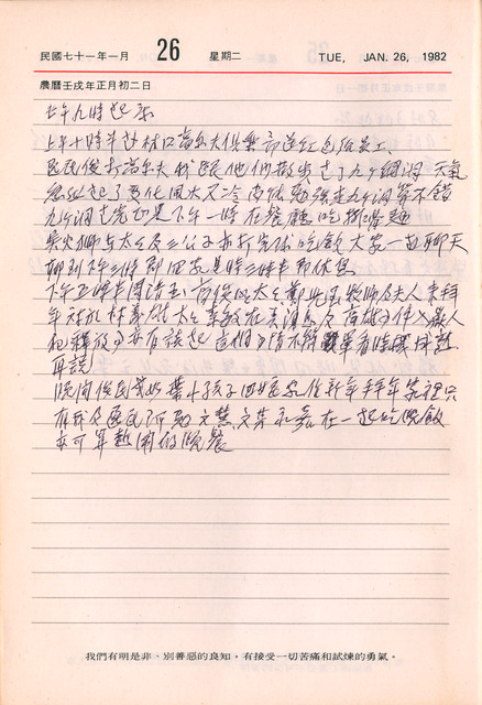此為吳三連寫於 1982 年 1 月 26 日之日記。上午吳三連赴林口高爾夫俱樂部送員工紅包,並與其子逸民、俊民打球。下午接待周清玉、高俊明太太、鄭兒玉牧師夫婦來拜年,並討論方素敏在美消息及美麗島事件下獄者釋放之事。然此事無法簡單解決,須待時機成熟。   1979 年 12 月 10 日,《美麗島》雜誌社於高雄舉辦人權紀念會,吸引大批民眾參加,為此治安單位派出大量鎮暴部隊進行監控,最終場面失控導致警民嚴重衝突,「美麗島事件」爆發。「美麗島事件」爆發後,多人遭逮捕下獄,其中包括黃信介等八人受控叛亂罪,周清玉之丈夫姚嘉文亦在其中,而高俊明牧師則是因為協助施明德逃亡而被判刑。本篇日記時間為 1982 年初,距離美麗島大審已過了二年,部分受刑人已陸續出獄,在一眾黨外勢力的協調下,受刑人的狀況與生活環境皆有改善。然而當時黨外勢力也僅能努力至此,多次營救受刑人的請願皆被駁回,美麗島事件的受刑人仍須待到 1990 年臺灣首次總統直選以後,當選總統的李登輝簽署發布特赦令才得被釋放。