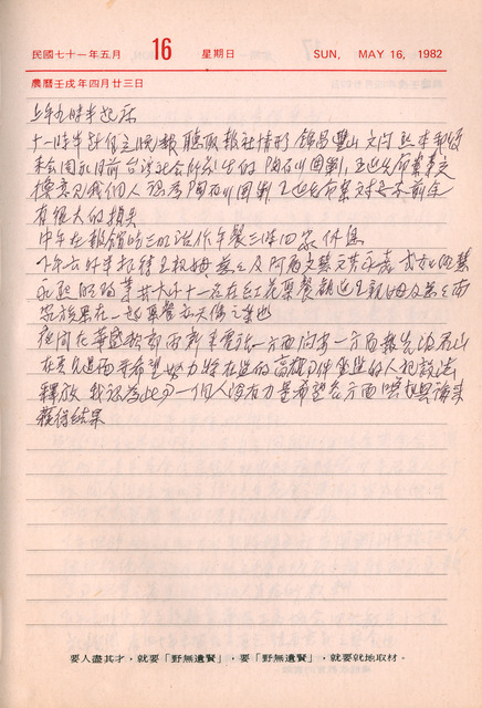 此為吳三連寫於 1982 年 5 月 16 日之日記。上午吳三連前往自立晚報聽取社務狀況,後與王錦昌、吳豐山、顏文閂、張熙本、沈邦頎等討論陶百川圍剿與王迎先命案等事。吳三連認為此二事將對國家前途有大損失。下午返家,與王親母、慈慈、吳阿勉、吳文慧、吳文芳、吳永嘉、謝式如、吳明慧、吳永熙、吳明珣等家人一同至餐廳聚餐。晚間接到郭雨新自華盛頓之來電,告知吳三連沈君山曾在美國與其見面,並提及要設法將美麗島事件之受刑人釋放。吳三連認為此事欲達成,要從各方面來喚起輿論。   上文提及之美麗島事件,是於 1979 年 12 月 10 日國際人權日,發生在高雄市的一場重大官民衝突事件,而對其後臺灣的政治局面演變有著極大的影響。 1979 年時,《美麗島》雜誌的主要成員黃信介、施明德、張俊宏等於高雄市舉辦「人權紀念會」,大批民眾參加。治安單位應付此狀況派出大批鎮暴部隊,最終場面失控引發嚴重衝突。隨後相關人士即受警總以叛亂罪嫌肆意逮捕,並以軍法審判、判刑。日記當時的 1982 年,多數美麗島受刑人尚未獲釋,吳三連多次受人請託,為美麗島事奔走,也前往探監過。從吳三連日記來看,吳三連在檯面下為美麗島事件進行的朝野協商相當之多,對於後來事件的發展有著不可忽視的影響。