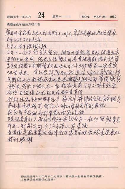 此為吳三連寫於 1982 年 5 月 24 日之日記。上午吳三連至自立晚報社與陶百川、余紀忠、沈君山會面,談話中沈君山提及其請陶百川作團結自強協會之諮議委員,後余紀忠談起陶百川壽圍剿一事。後至環球休息,下午蔣治平來請吳三連核定薪水文件。晚間返家晚膳,後接到吳秀山孫女、列茂林二來電,前者說明希望拜訪並約定時間,後者邀請參加喜宴,然婉拒。   上述提及之陶百川,在日記當時候受沈君山邀為團結諮詢委員會的一員,期望陶可以協助團結朝野。陶百川並於此日記數日後出國訪美,協助團結自強協會工作——與海外政治見解不同的團體溝通、設法安排海外人士返國探親等。