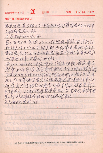 此為吳三連寫於 1982 年 6 月 20 日之日記。吳三連在宅前送行慈慈前往機場,謝式如則攜吳明慧、吳永熙、吳明珣一同至機場送慈慈返馬尼拉。後吳三連前往自立晚報,與王錦昌、吳豐山、吳啟章、顏文閂、沈邦頎閒談。下午前往環球水泥處理事務,便往出席陳文成忌日籌備會,會上有其父陳廷茂、尤清、鄭兒玉等人。會中報告治喪會之收支,擬將其淨收入成立獎學基金會。   上文提及之陳文成,逝世於 1981 年 7 月 3 日,即本日記前一年。陳文成生前於海外支持臺獨運動,並曾捐款予《美麗島雜誌》,然在返台探親與演講後突然受警總約談帶走,後即被發現陳屍於臺大。此命案引起海內外震驚,然至今仍為懸案,難以追查。從日記來看,作為黨外耆宿的吳三連,對此命案十分關心。從明可見吳三連對於陳文成治喪事相當熱心,擔任治喪委員會之主委,主持祭禮。而從日記中我們也能窺得,其協調家屬、黨外、國民黨關係的樣貌,進而能知吳三連在陳文成事件後作為黨內外溝通橋樑的重要性。