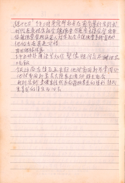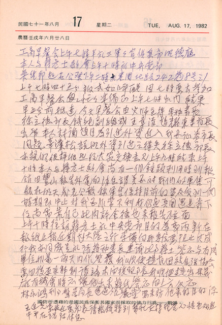 此為吳三連寫於 1982 年 8 月 17 日之日記。上午吳三連前往工商早餐會,由吳火獅主持,馬紀壯、徐立德、錢純、王章清、趙耀東等皆出席,會中討論外資進入我國證券市場之效應。後至自立晚報,與吳豐山討論八一七公報對臺灣之影響,並晤面許金德。再往訪蔣彥士,討論郭雨新赴大陸之事,並提起團結自強協會之體制問題,以及林義雄釋放之建議。後刑事警察局長林永鴻來,希望自立報社協助其發表王迎先案。而趙丕承亦來關心郭雨新之事。下午參加吳維邦告別式,並赴蒲添生處作塑像。   上文提及之《八一七公報》,是美國與中共兩方處理臺灣問題的基礎,與《上海公報》、《建交公報》合稱「中美三個聯合公報」。本日記的時間正是其發表的當日。公報內容除重申美國承認中華人民共和國為中國的唯一合法政府,同時也認知國際上只有一個中國、臺灣是中國的內政問題。而在公報此之上,更強調美國將逐步縮減對臺灣之軍售,表明美國不打算長期向臺灣出售武器。此公報的發表嚴重影響美國對台灣的軍售以及台灣的國防能力,吳三連作為國防基金會的一員,同時也作為一個報人,對此事自是相當關注,並認為美國不可靠,臺灣需要自力發展國防。