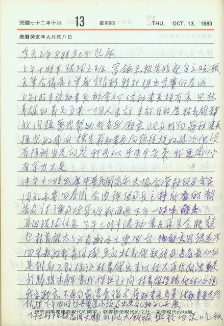 本篇為吳三連寫於1983年10月13日之日記。當日上午吳三連到環球水泥公司上班,趙富鎰來報告前一日自立晚報主筆會議之情形。之後吳三連與沈君山有約,但只有林義雄之義兄來拜訪,請吳三連協助釋放林義雄之事。中午吳三連到國賓回春園出席中華民國高爾夫協會常務理事會。下午沈君山來拜訪吳三連,談到方素敏回臺參選之事,兩人均表示反對,會談結束後吳三連先去國賓大飯店送小坂出先禮物,之後去圓山大飯店拜訪高岡大輔。   日記中提到之林義雄,曾任臺灣省議員,後因美麗島事件被捕入獄,在受審期間其家中的年邁母親與女兒們慘遭殺害,此即林宅血案。此時(1983年)林義雄正入監服刑,於1984年才出獄,本篇日記提到林義雄的義兄方清吉以及沈君山分別來拜訪吳三連,所談之事均與釋放林義雄有關,據吳三連與沈君山的討論結果,之所以當局不放人可能係因為無法保證林義雄出獄後是否會在涉及政治之故,且同時其妻方素敏打算參選1983年底之立法委員,吳三連打算去探望林義雄詢問其看法。