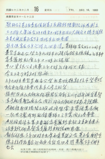 本篇為吳三連寫於1983年12月16日之日記。當日早上吳三連出席吳登芳逝世公祭,之後出席歌林公司創立20周年酒會道賀,結束後回到環球水泥公司上班,因女兒吳梨雪來電要與吳三連共進午餐,因此取消黃綿綿的宴會。之後周清玉、方素敏、高李麗珍來訪。下午吳三連出席國賓董監事會、董事會,由許金德主持,借款案全數通過。   關於日記中提到來訪的周清玉、方素敏與高李麗珍,三人均為美麗島事件被捕者之家屬,其中方素敏與高李麗珍參與1983年12月3日舉辦之增額立委選舉,最後方素敏當選、高李麗珍落選,在選舉之前三人曾多次拜訪吳三連向他尋求協助。據吳三連日記所述,關於方素敏參選之事曾遭各方反對,吳三連曾受託前往監獄探望服刑中的林義雄(方素敏之夫),林義雄亦反對方素敏參選,據日記所述,吳三連本人並沒有特別反對方素敏參選之事,但仍轉達林義雄等人的意見,方素敏最後仍堅持參與選舉。