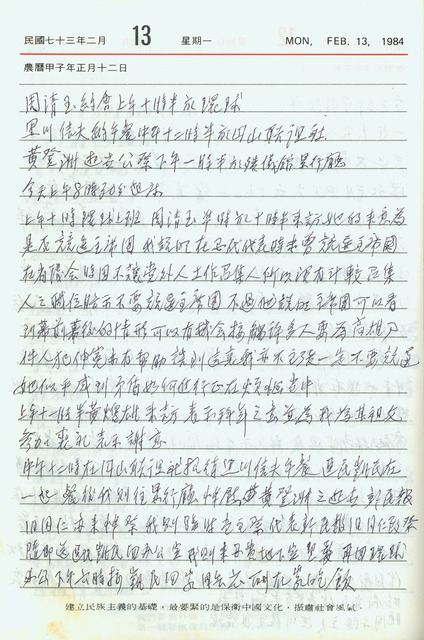 此為吳三連寫於1984年2月13日日記。上午周清玉、黃煌雄分別來訪,中午與黑川信夫午餐,下午則赴景行廳悼慰黃登洲並代表新民報舊同仁致祭。   周清玉為姚嘉文之妻,她在姚嘉文因美麗島事件遭逮捕之後,為營救丈夫,經常拜訪吳三連尋求協助,更於1980年「代夫出征」參選國代,受到民眾熱烈的支持形成「周清玉震撼」對國民黨造成壓力,並以最高票當選。由於本年度要選舉第七任正、副總統,因此國民大會即將召開第一屆第七次會議,根據「國民大會組織法」規定,必須設立主席團,本次主席團主席台灣地區分配到七名,本日周清玉來訪主要是針對參選主席團一事與吳三連討論。吳三連表示他個人在國代時期未參選過主席團,省議員時期黨外人士也無法擔任,以此暗示周清玉不要參選主席團,然她認為主席團可以看到幕前幕後的情形,有機會可以接觸許多人,對於高雄事件受難者伸冤能有幫助,但因吳三連不表贊成,而感到困擾不已。稍後來訪的黃煌雄,因前些日子其父的告別式吳三連專程赴宜蘭表示悼念,為此黃煌雄於本日來表示感謝之意。   黃登洲為吳三連在台灣新民報時期的同事,他在1932年擔任台灣新民報社調查部長時,吳三連為《台灣新民報》日刊編輯總務、論說委員、整理部長兼政治部長。本日為黃登洲的告別式,吳三連與台灣新民報時期的舊同事都來悼念。