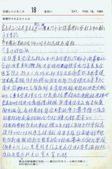 此為吳三連寫於1984年2月18日日記,吳三連赴位於民生東路的麥當勞門市開幕典禮剪綵,為美國速食業者麥當勞在台灣設立的第一家分店。麥當勞於1955年由克羅克(Ray A. Kroc)成立於美國芝加哥,其推出的美味漢堡和親切服務,立刻受到各界人士的歡迎,並以加盟的經營模式,在全美擁有超過五千間的麥當勞。新開幕的麥當勞是由行事低調、鮮少露面且被媒體稱為「潛水艇」的寬達食品負責人孫大強引進台灣的,並由孫大偉擔任董事長,以品質、服務、衛生與超值等核心價值廣獲消費者支持,在台灣成為知名的速食店。本日除吳三連到場祝賀外,還有許金德、石永貴等人,吳三連對於孫氏兄弟表示讚許,同時認為麥當勞的開幕是符合工業社會的需求。然在1992年4月28日,台灣發生一起震驚當時台灣社會的「麥當勞炸彈案」,當時歹徒要向麥當勞勒索600萬元,並在民生東路麥當勞廁所天花板裝置炸彈,當時的總經理孫大偉拒絕被勒索並報警處理,最後歹徒被逮捕,但也造成拆彈員警一死一重傷的憾事。
