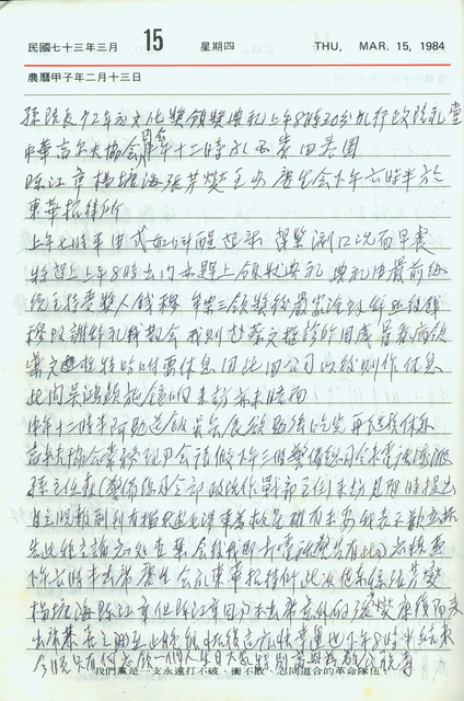 此為吳三連寫於1984年3月15日日記,吳三連上午趕往由嚴前總統主持行政院頒獎典禮,錢穆、牟宗三受獎,會後前往蔡文哲診所看病領藥,回公司後遵照醫囑休息,期間吳鴻顯、施鐘響曾來訪未見,高爾夫協會常務理事會亦請假。下午陳守山來電,囑派警備總司令部政治作戰部主任孫森告知自立晚報副刊有不妥內容,應處查禁,吳三連表示歉意,並於會後我去電警告。晚間出席張芳燮、楊塘海、陳江章於東華招待所舉辦的慶生會,陳江章因事未到,張芳燮康復出席,此次為何應欽祝壽。   日記中所提及的警備總司令部,係為臺灣警備總司令部,是戒嚴時期負責警備治安、動員管理的軍事機構。原負責受理日本投降、接收臺灣,及遣送日僑等任務,改制後工作範圍包括加強肅奸、防諜,協助緝私、檢查,管制物資、交通,及執行非軍人身分之戒嚴業務等。戒嚴時期的警備總部的職權與業務範圍非常大,卻無公開的監督機制,其對言論自由的箝制與對人權的諸多戕害,多為社會所詬病,要求裁撤之聲不斷。隨著1987年解嚴,其所管轄的出入境、出版品審查、郵電檢查、內亂罪的偵察與審判等業務分別移交給行政、司法單位,警備總部也於1992年8月1日裁撤。吳三連為自立晚報發行人,是以警備總司令部在發現其副刊中含有「毛澤東為救星」的描述後,派人前來勒令改善。從此處可以看見戒嚴時期中政府對報章雜誌言論自由的箝制。